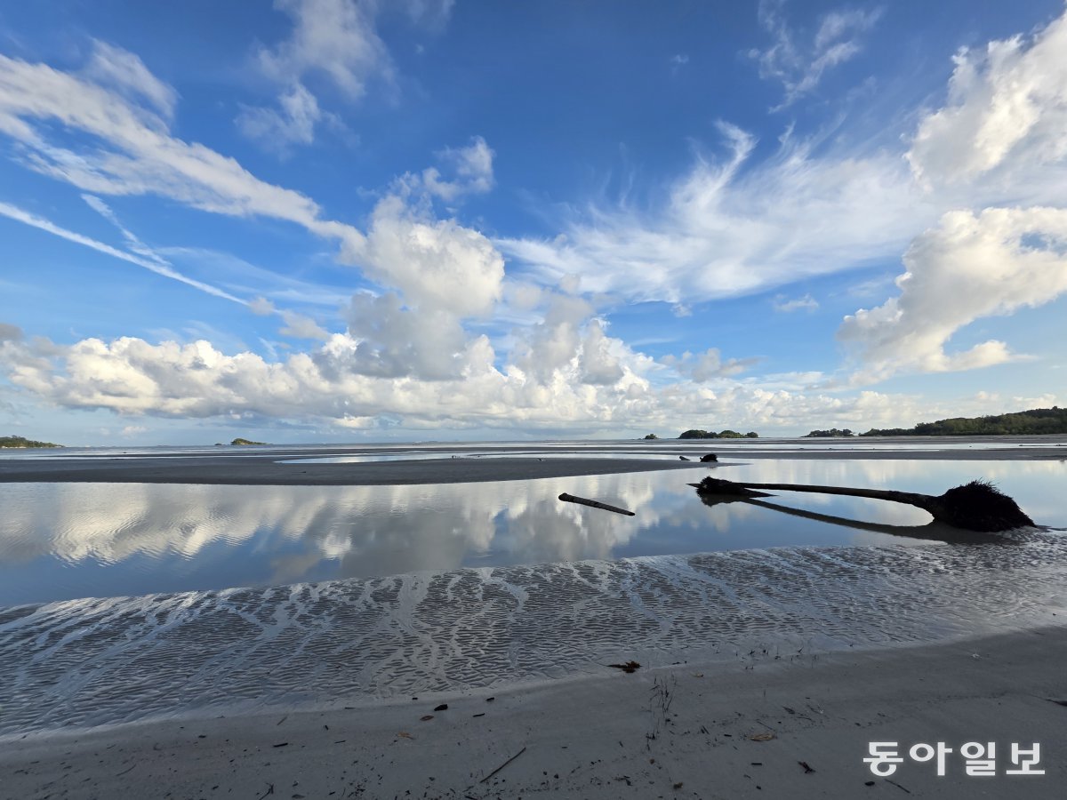 빈탄 라고이 해변의 아침. 물이 고인 해변에 푸른하늘과 흰구름이 비치고 있다.