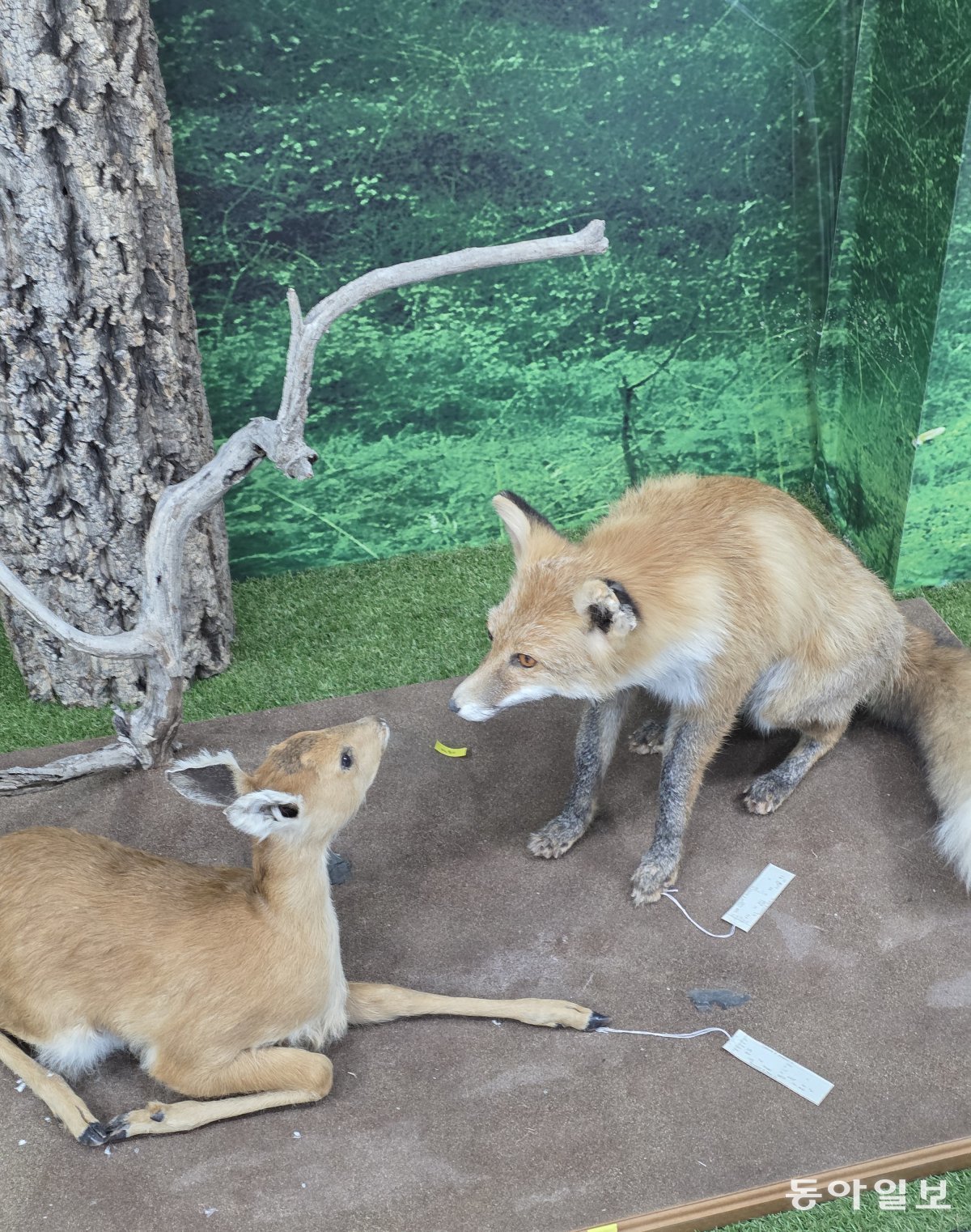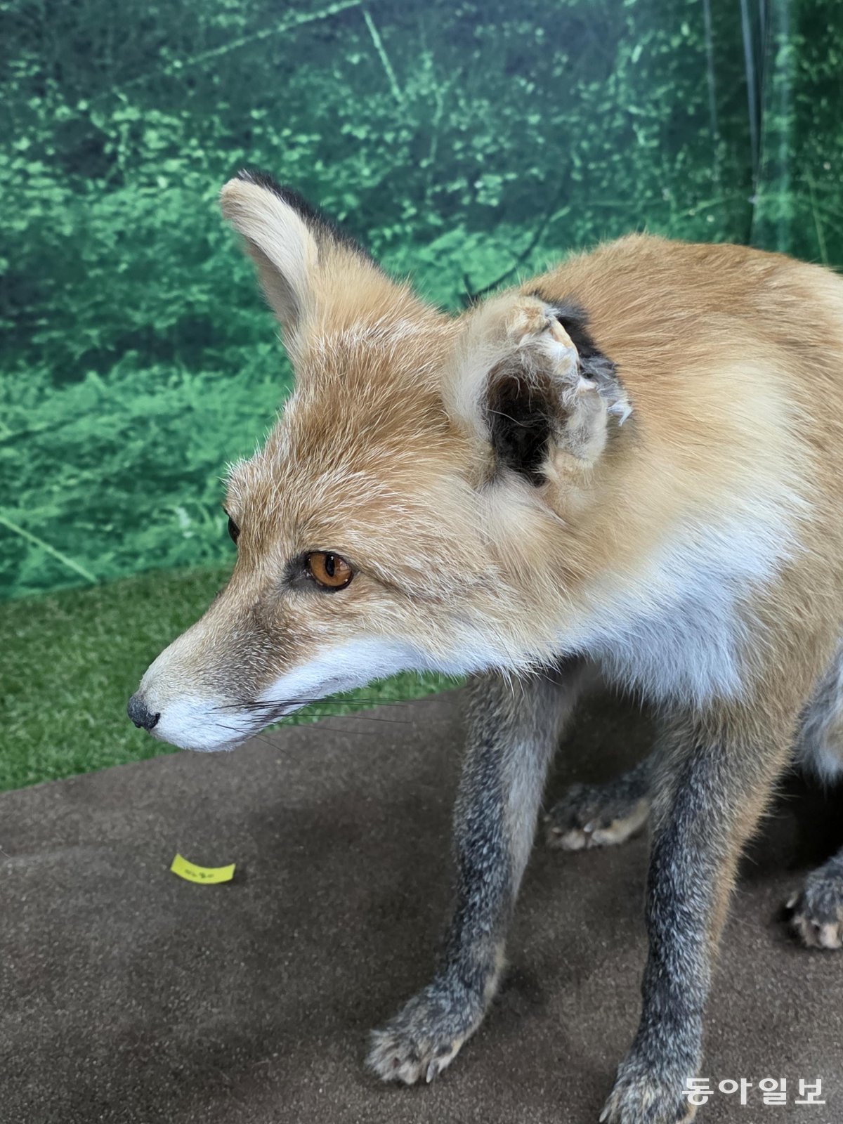 ‘여우생태관찰원’에 들어가면 먼저 죽은 여우를 살아 있던 모습 그대로 박제한 모습을 볼 수 있습니다. 여우는 개과 동물입니다. 하드웨어 몸집은 중간 크기의 개를 닮았습니다.