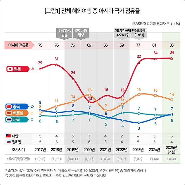 해외여행의 아시아 점유율이 코로나 이전 75% 수준에서 작년 81%, 올해 83%로 증가한 것도 일본 여행의 인기에 크게 힘입은 결과로 풀이된다.