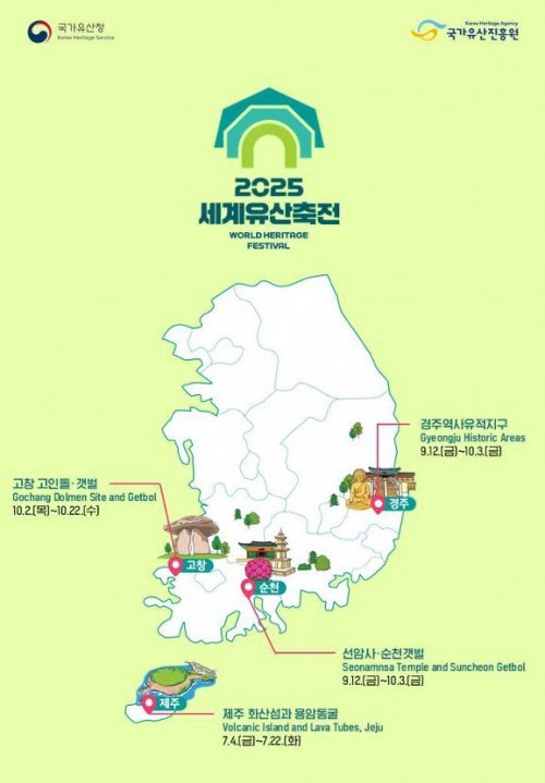 국가유산청(청장 최응천)은 국가유산진흥원(원장 이귀영)과 함께 제주(7월 4~22일)를 시작으로 경주(9월 12일~10월 3일), 순천(9월 12일~10월 3일.), 고창(10월 2~22일)에서 ‘2025년 세계유산축전’을 순차적으로 개최한다고 밝혔다.