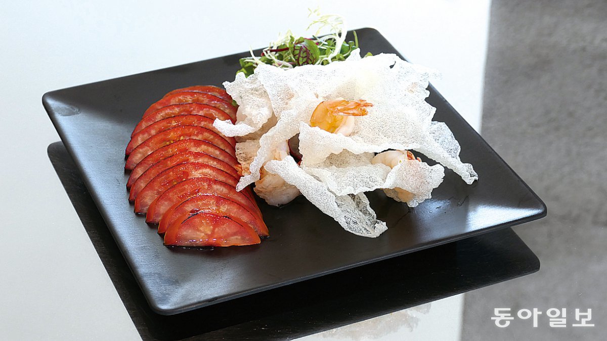 비스트로 ‘게미’ 전채 요리.지중해만 아니라 남해의 고갱이를 하드웨어와 함께 소프트웨어에도 적용했다. 특히 먹는 것이 그렇다. 호텔 3층 퓨전 식당 ‘바래’를 보자. 바래는 ‘썰물로 드러난 갯벌에 조개를 캐러 간다’라는 남해 말이다. ‘아낙들이 물때가 바뀌면 바닷가에 나가 미역, 톳을 한 줄기 뜯고, 조개 하나씩을 캐는 행위’가 바래다. 생계 수단이 아니라 하루 먹는 데 필요한 만큼만 채취하는, 대자연에 겸손한 행위다(‘남해 바래길’, 이서후 지음, 피플파워, 2017). 한입 메뉴와 그에 알맞게 곁들인 주류를 음미할 수 있는 식당 ‘게미’ 역시 마찬가지다. 게미는 남해 말로 음식에 깃든 깊은 맛과 정성을 뜻한다.