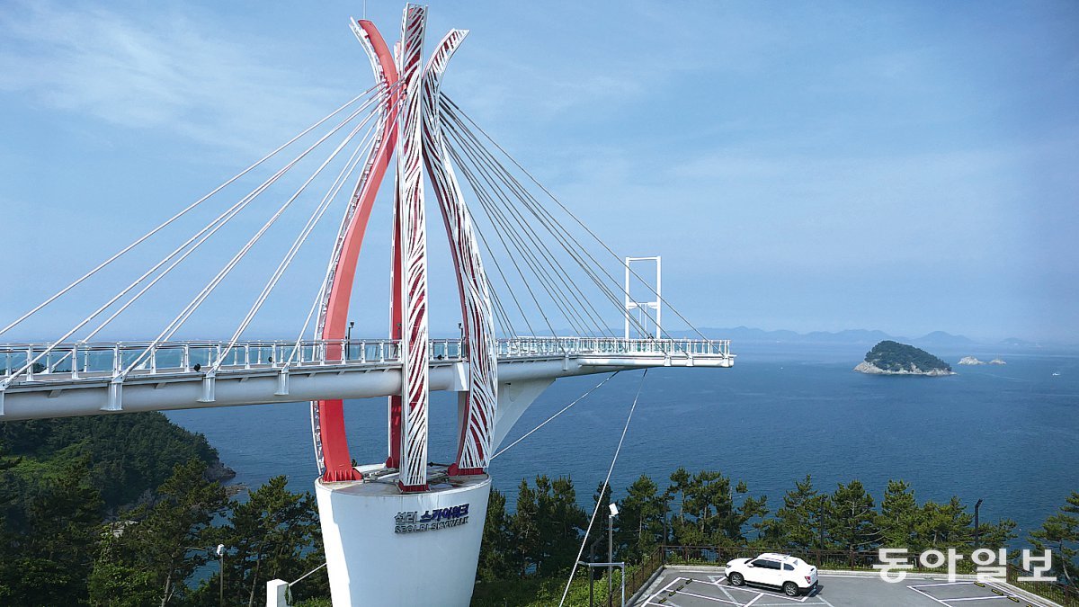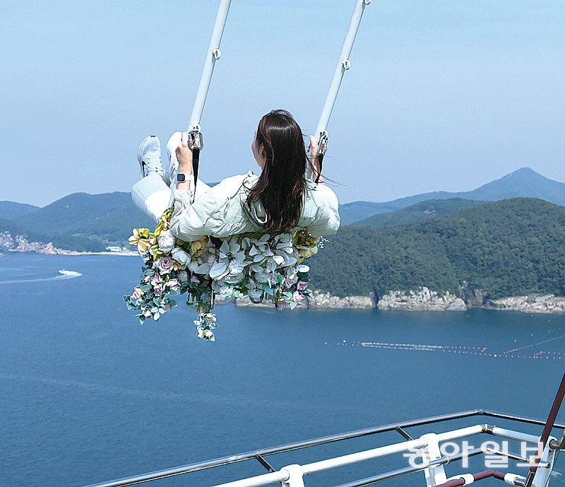 설리스카이워크 맨끝에 달린 ‘하늘 그네’에서 창공을 날다.그 끝에서 남해를 360도 조망할 수 있다. 북쪽 저 멀리 기암괴석으로 유명한 금산이 보인다. 설악산 울산바위를 축소해 가져다 놓은 듯한 암벽들이 우뚝하다. 하늘길 끝에는 ‘하늘 그네’가 있다. 밧줄이 아니라 철제 파이프가 전기 동력을 이용해 그네를 창공으로 밀어 올렸다가 내렸다 한다. 탄성과 비명이 적절히 섞인 소리가 탄 사람 입에서 터져 나온다.