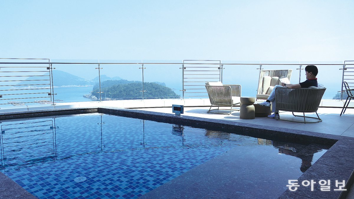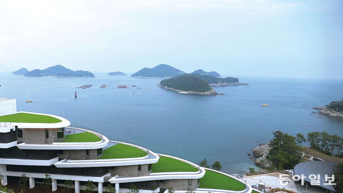 쏠비치 남해 전경그 오른팔에 해당하는, 바다로 뻗어 내린 단애(斷崖) 위 약 9만3000㎡(약 2만8000평) 터에 ‘쏠비치 남해’ 리조트&호텔이 이달 5일 문을 열었다. 남해 명물 다랑이(비탈진 산골짜기 계단식 좁은 논배미) 형태로 빌라 7개 층(지하 1층, 지상 6층)이 있고, 그 위로 지하 2층, 지상 14층 호텔이 자리 잡았다. 남쪽을 면한 빌라 모든 객실(85실)은 물론이고 공중에서 볼 때 ‘Y’자 모양인 호텔 366개 전 객실에서 바다를 볼 수 있다.
