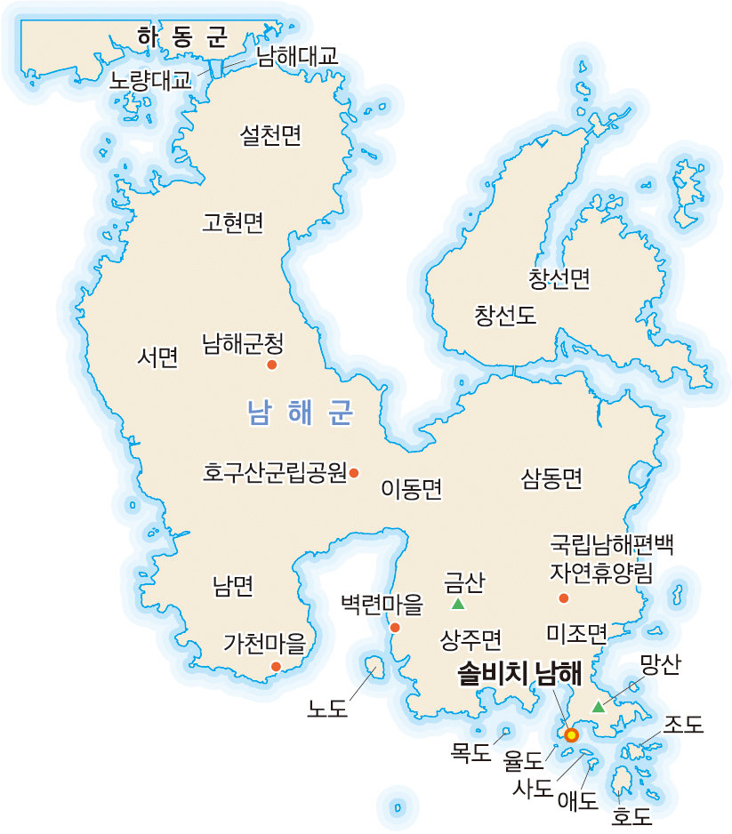 쏠비치 남해 전경바다뿐만 아니다. 유인도인 호도(虎島·범섬) 조도(鳥島·새섬)와 사도(蛇島·뱀섬) 장도(獐島·노루섬) 팥섬 콩섬 율도(栗島·밤섬) 미도(米島·쌀섬) 같은 무인도가 앞다퉈 다가오는 듯한 장관도 한눈에 들어온다. 옥색과 청록색이 어우러진 바다에 점점이 앞뒤로 가까이 늘어선 섬들이 산맥처럼 겹쳐 보인다.
