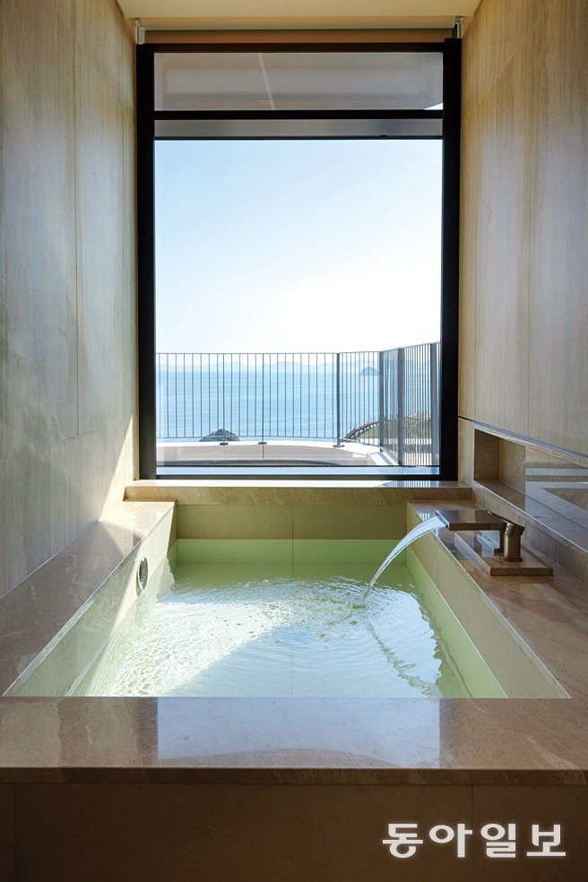 호텔 프리미어 스위트 욕실.루나(Luna, 달) 스텔라(Stella, 별) 솔(Sole, 해) 마레(Mare, 바다)라는 이탈리아어를 붙여 지중해 분위기를 낸 빌라는 85실 모두 독립형 구조다. 1층 14개 객실은 전용 풀(pool)이 있다. 실내 욕실 욕조에 앉아서도 통창으로 바다를 내려다볼 수 있다.