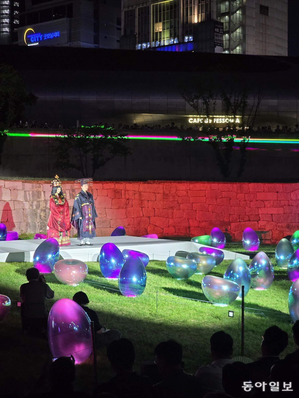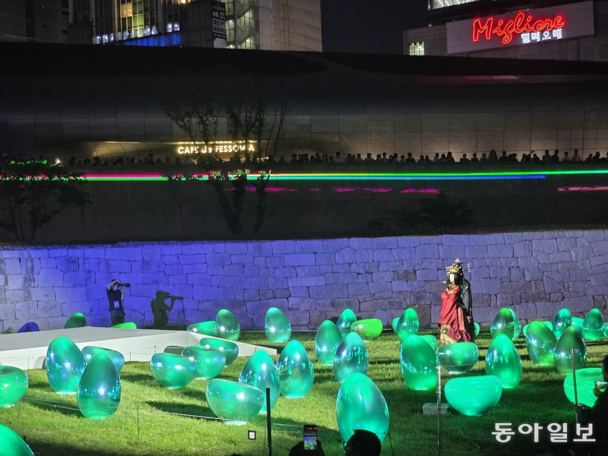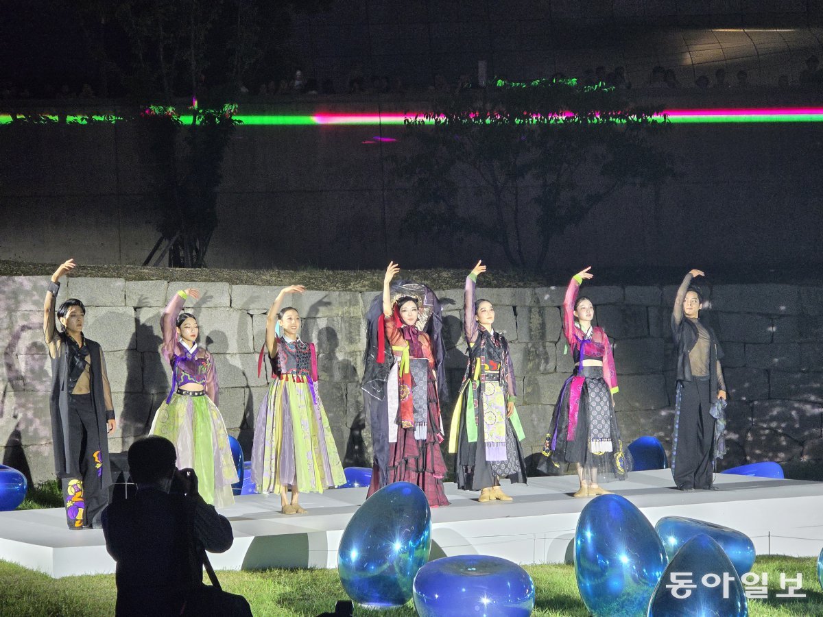 ‘서울라이트 DDP’는 그동안 도로에서 바라보이는 222m에 이르는 DDP 비정형 외벽 중심으로 미디어파사드 형식으로 진행됐는데요. 이번에는 처음으로 안쪽으로 들어가 있는 청계천 오간수문과 한양도성 성벽에서도 조명쇼가 시도됐습니다. 한양도성 앞 잔디반에 물방울 조형물이 놓여 있고, 성벽에 폭포가 흘러내리는 미디어아트가 펼쳐지고, 그 앞을 한복을 입은 모델들이 패션쇼를 하는 그림같은 장면이 개막식에서 펼쳐졌습니다.