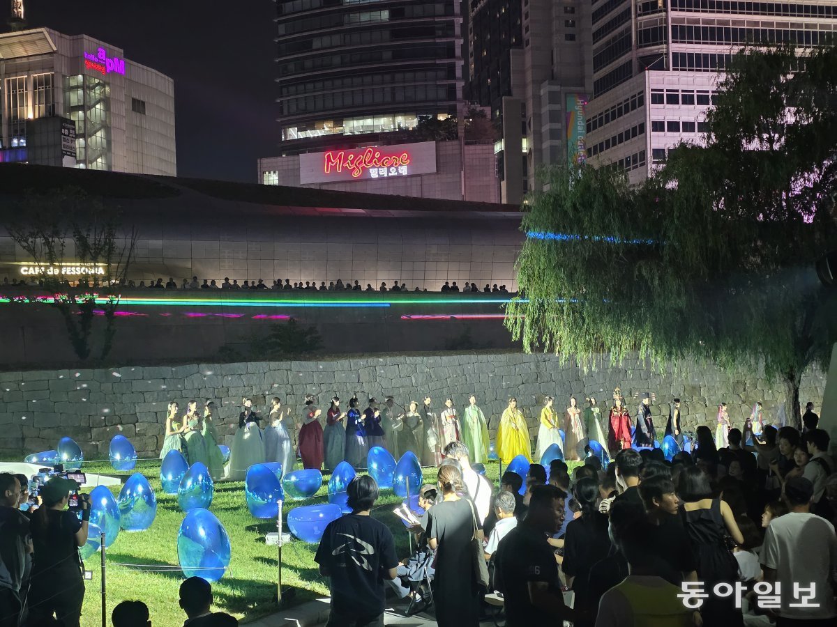 청계천 물길 옆에 심어진 버드나무 아래로 한복을 입은 모델들이 런웨이를 펼치며 등장합니다. 굿모닝시티, 두산타워 등 동대문 의류시장의 간판과 빌딩 조명, DDP의 유려한 곡선과 한양도성은 묘하게 어울립니다.