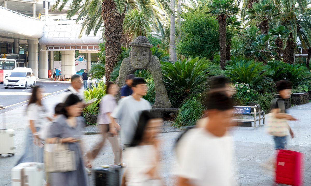 휴가시즌 최절정기를 맞은 2일 오전 제주국제공항 1층 도착장이 관광객들의 발길로 붐비고 있다. 2025.08.02 뉴시스광복절 황금연휴 기간 21만 명이 넘는 관광객이 제주를 찾을 것으로 예상된다.