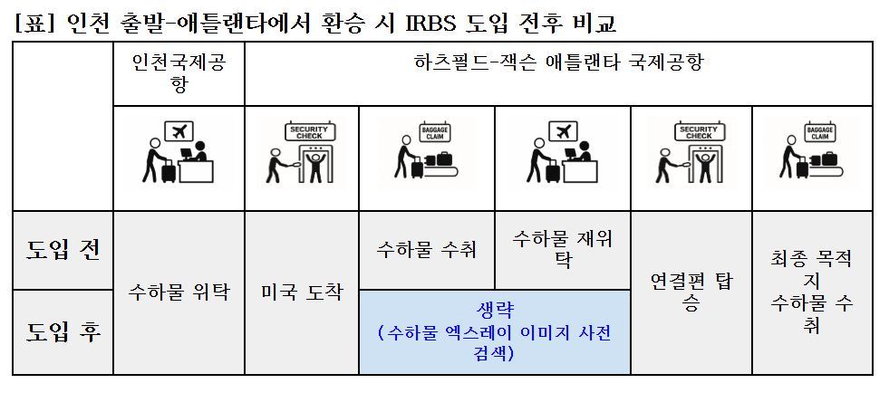 다른 국가나 지역에서 출발해 IRBS를 도입한 인천~애틀랜타 노선을 이용하는 경우에도 수하물 검색 간소화 혜택을 누릴 수 있다. 최초 출발지에서 수하물을 부친 뒤 항공편을 갈아타고 최종 목적지에서 수하물을 찾으면 된다.