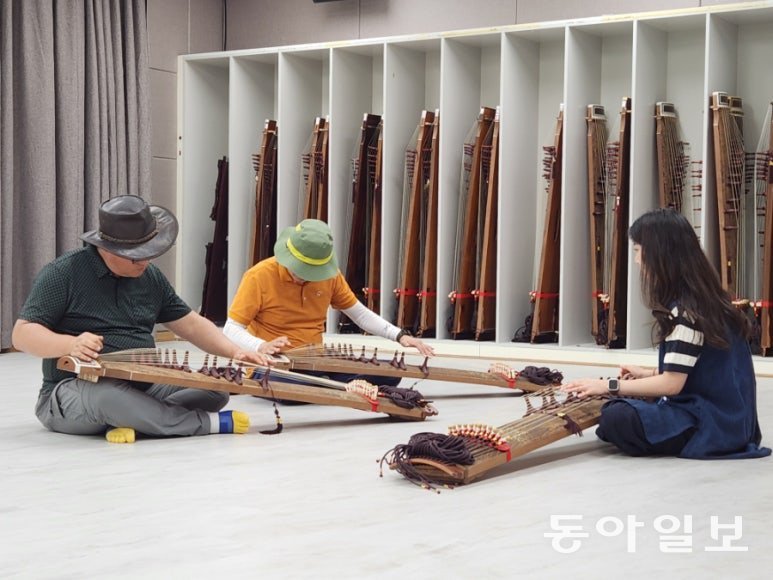 국악체험촌에서 가야금 강습을 받는 여행객.