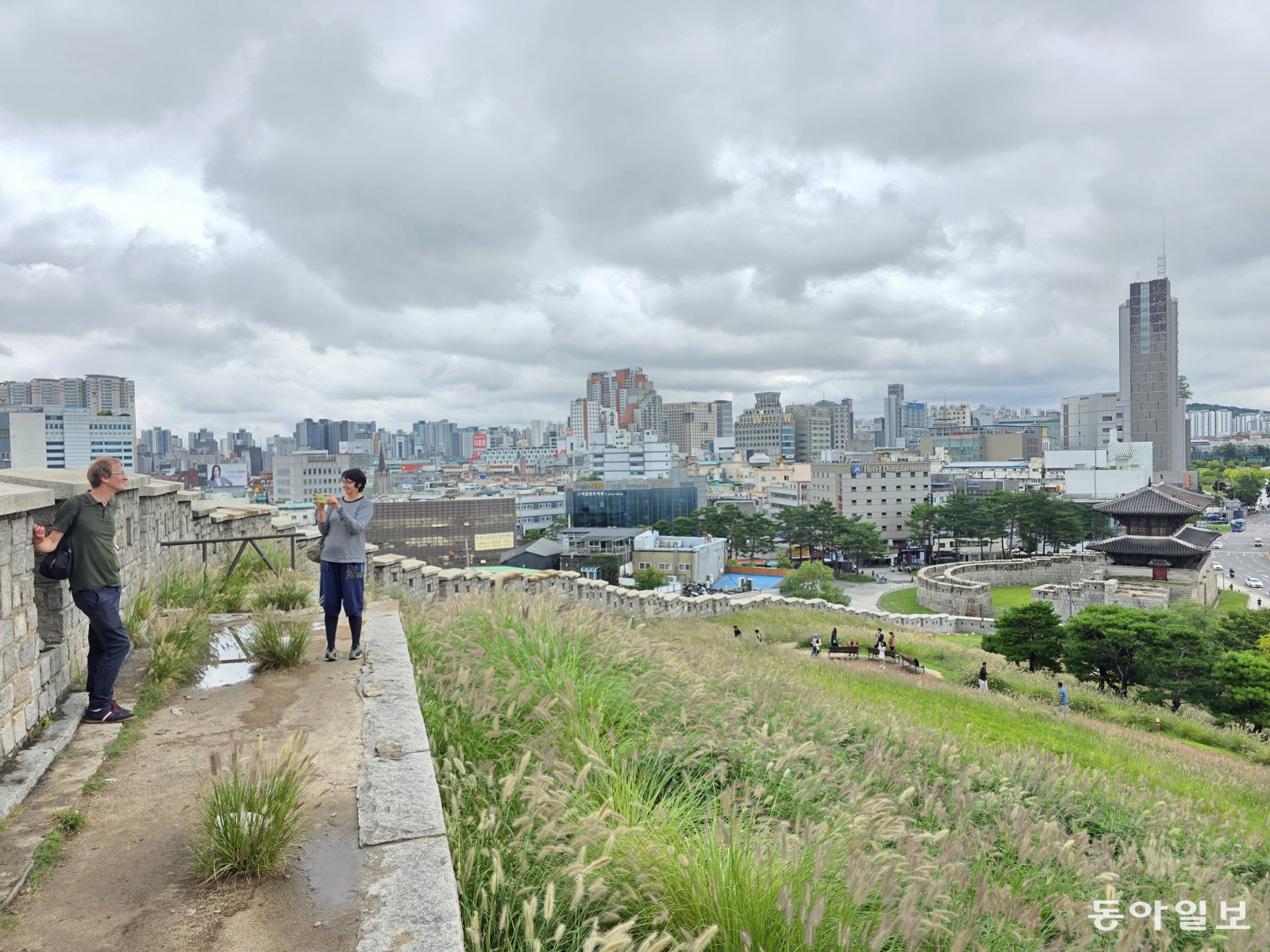 한양도성 성곽길에서 내려다본 동대문 풍경. 전승훈 기자 raphy@donga.com그 해답을 찾아 동대문디자인플라자(DDP)에서 낙산공원까지 성곽 길을 걸었다. 흥인지문에서 한양도성으로 오르는 길, 솜털이 보송보송한 수크렁이 바람에 흔들린다. 성곽 길 이화마을의 전망 좋은 카페도 특수를 누린다.