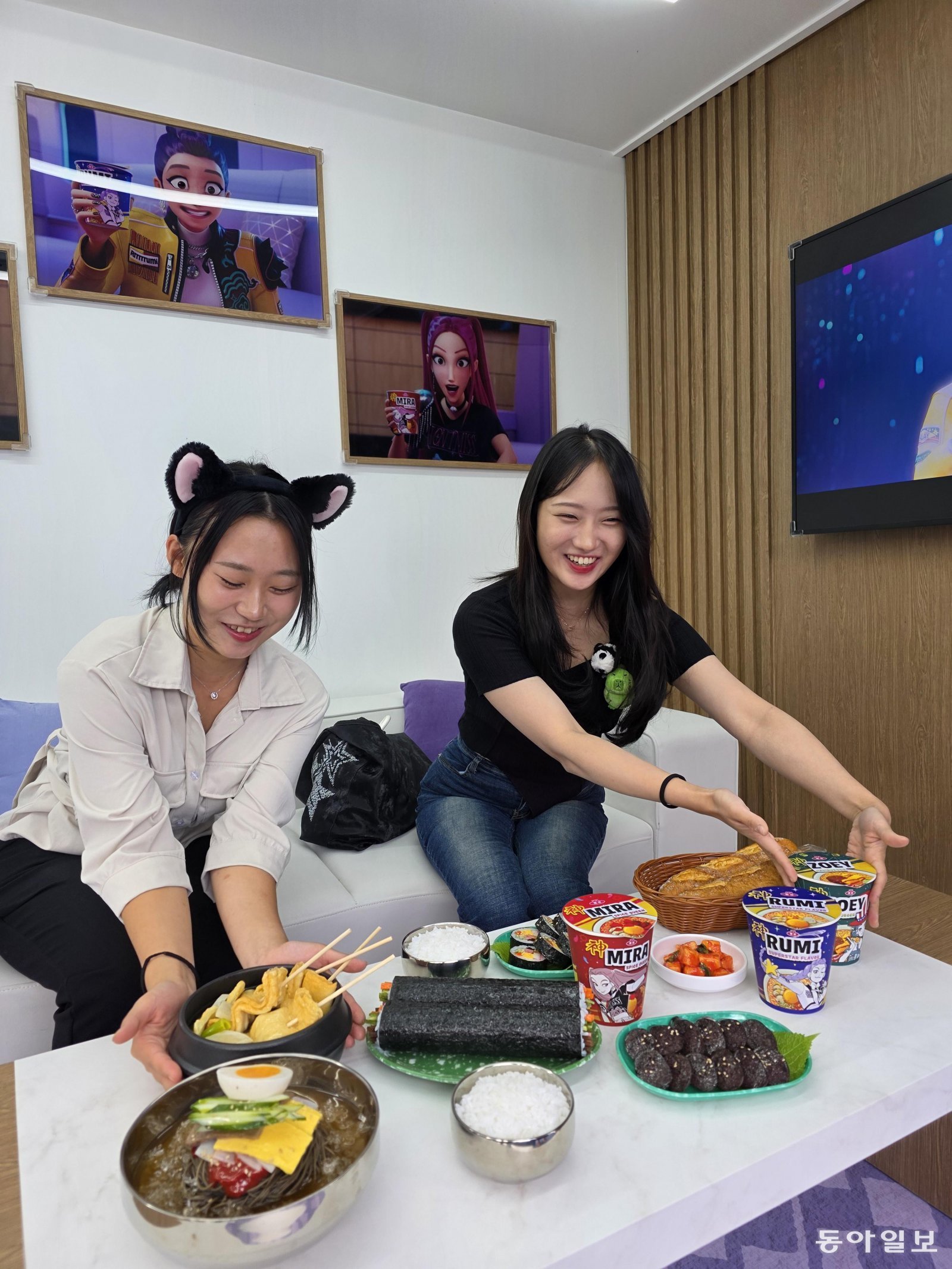 용인 에버랜드에 지난 26일 개장한 케이팝데몬헌터스 테마존. 헌트릭스 멘버들이 비행기에서 먹던 김밥, 떡볶기, 라면 앞에서 기념사진 촬영을 하고 있다 . 전승훈 기자 raphy@donga.com헌트릭스가 비행기에서 먹던 김밥과 라면 떡볶기 앞에서 사진을 찍고, 청담대교를 건너는 지하철에서 악귀와 싸우며, 붉은 불꽃 피어 오르는 악령의 세계에서 사자보이즈 갓을 쓰고 포즈를 취했다.
