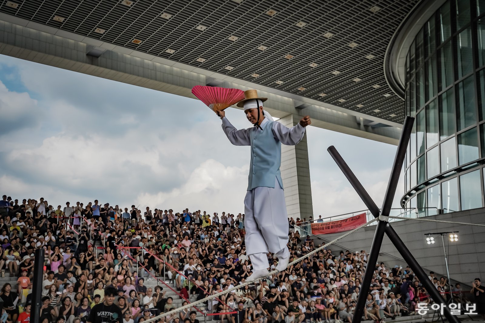 8일 서울 용산구 국립중앙박물관 열린마당에서 줄타기보존회가 선보이는 공연 ‘판줄’. 국립중앙박물관 제공.